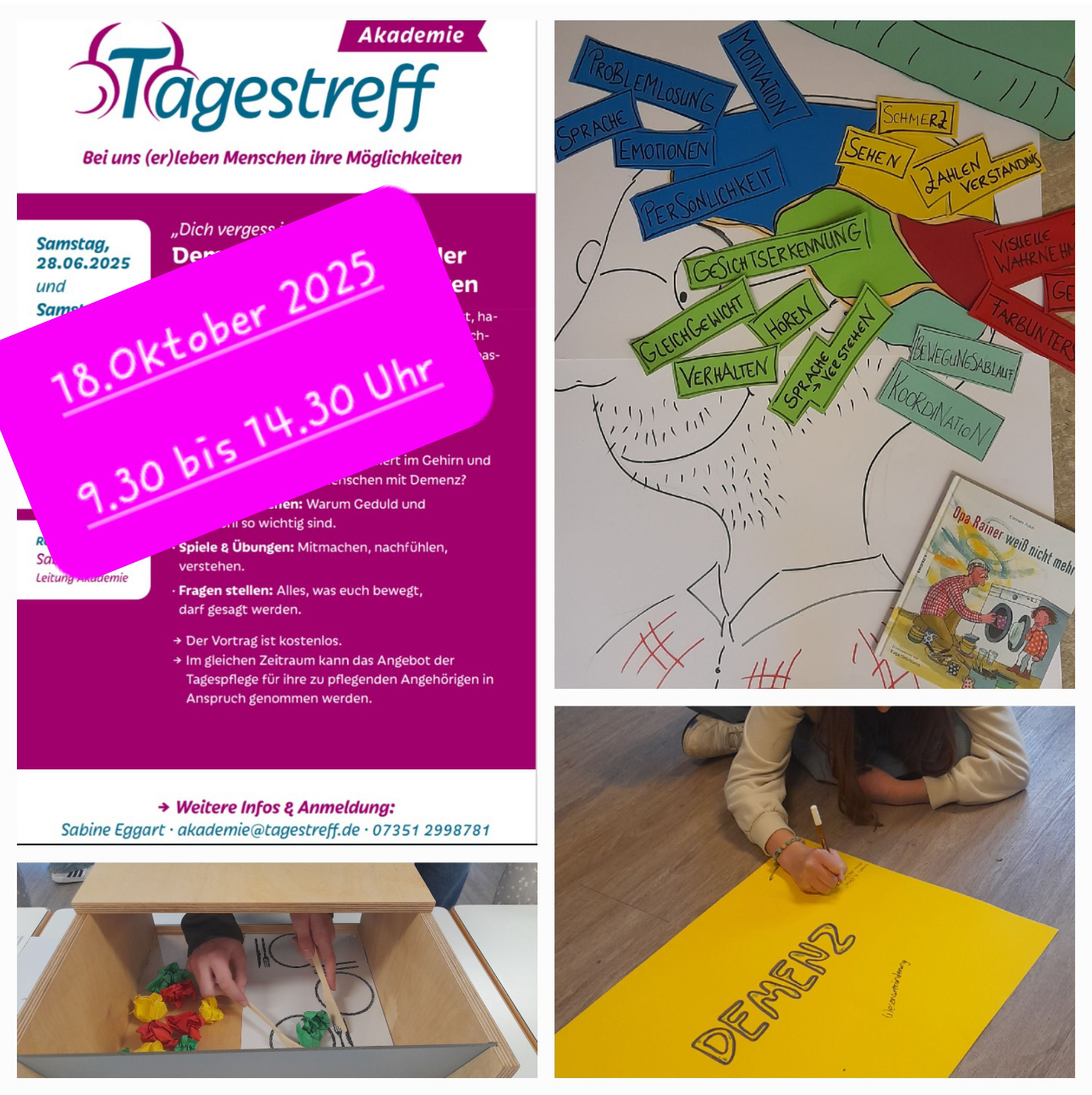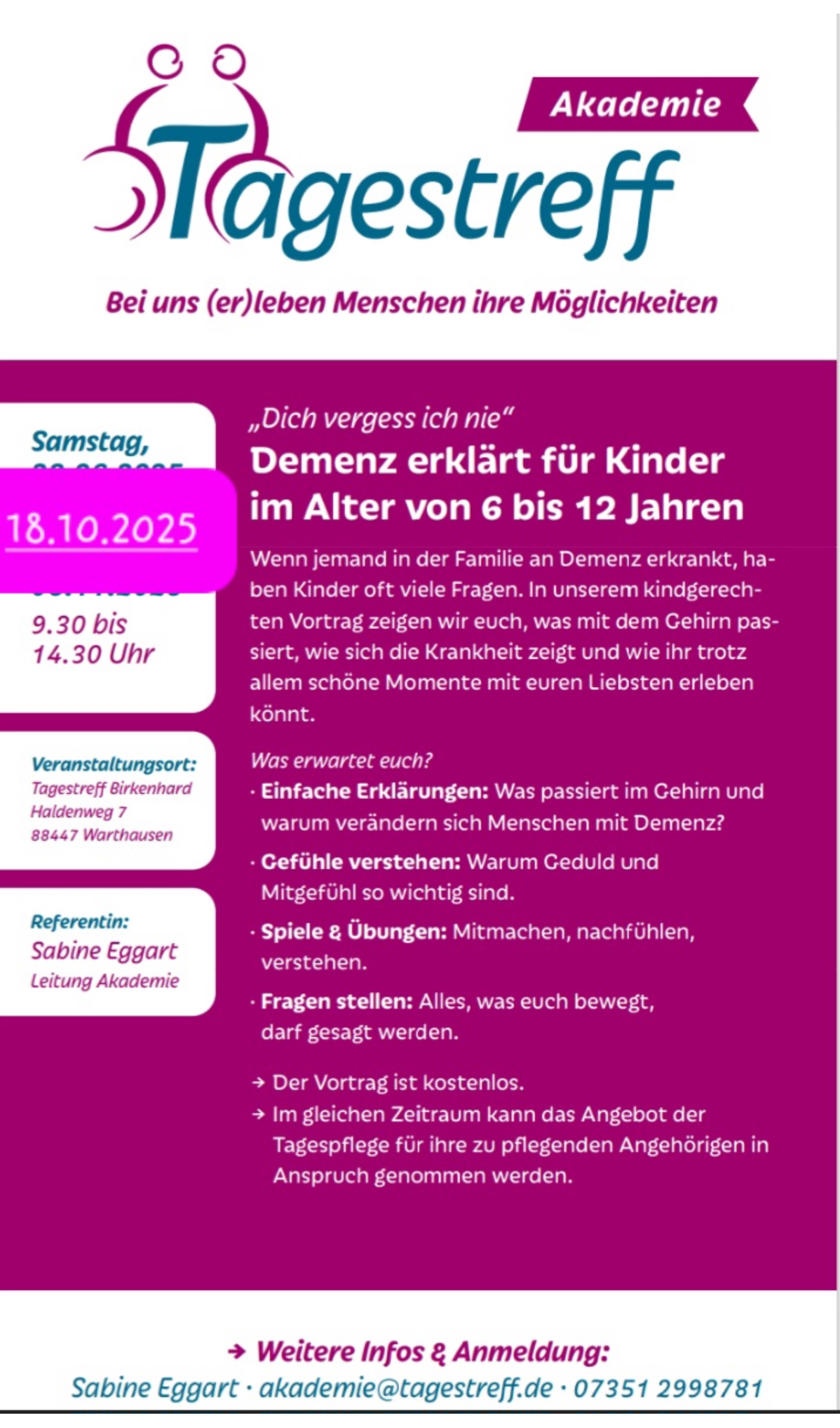 In einem kindgerechten Vortrag mit Workshop gehen wir gemeinsam auf das Thema Demenz ein. Die Kids werden dafür sensibilisiert und lernen zu verstehen, was Demenz bedeutet und wie man damit im Alltag umgehen kann.