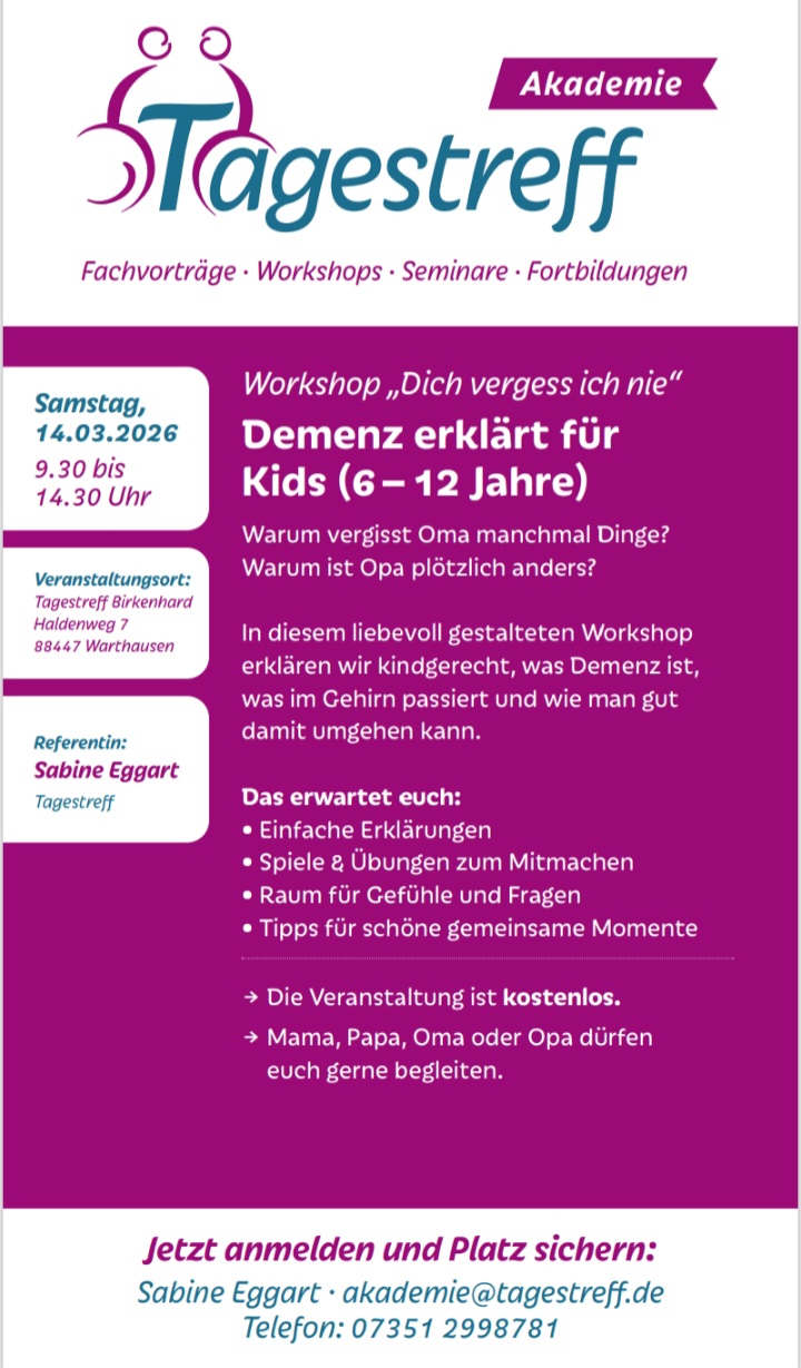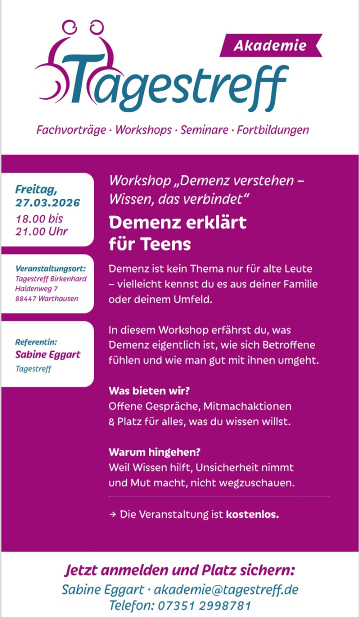 Sei dabei: Anmeldung unter Akademie@tagestreff.de oder 07351 2998781